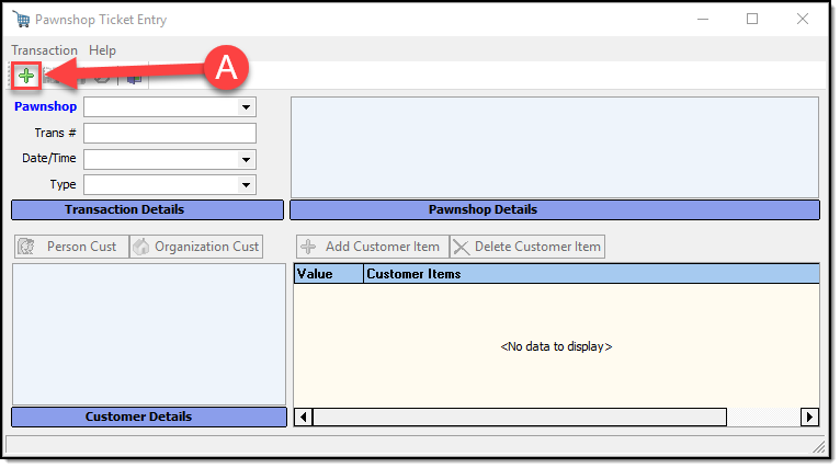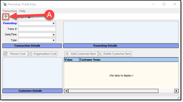 This opens the Pawnshop Ticket Entry window. Press the green Add button to start entering a new pawn ticket (A).