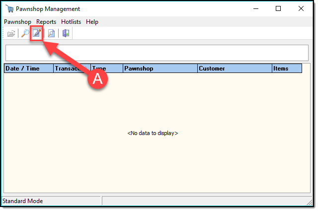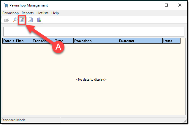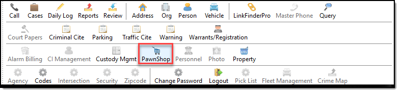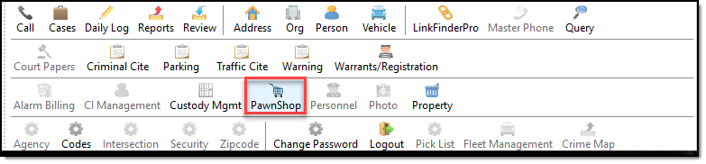 The Pawnshop Management application allows you to track pawn tickets, and create hot list reports. To access Pawnshop Management, press the ‘Pawnshop’ button on the main toolbar.