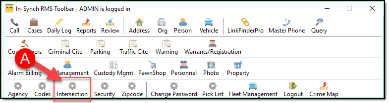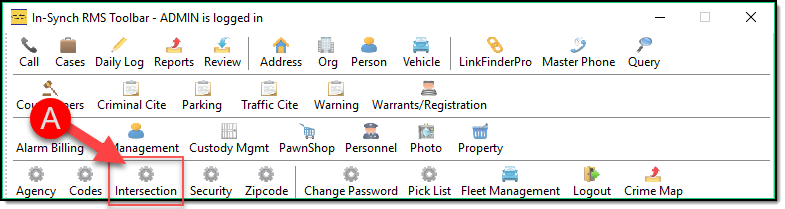 Intersection Management is a configuration module for creating and managing the Intersections used throughout the In-Synch RMS software. By default, Intersection Management is granted to members of the Administrator security group but can be granted or denied for any user. To access Intersection Management, click the “Intersection” button (A) on the main In-Synch RMS toolbar.