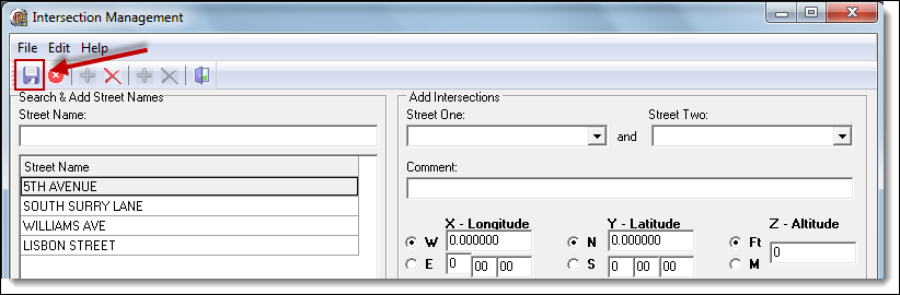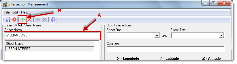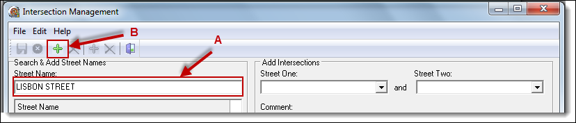 1. From the Intersection Management window, enter the main road’s name into the “Street Name” field (A), and then click the “Add” button (B).