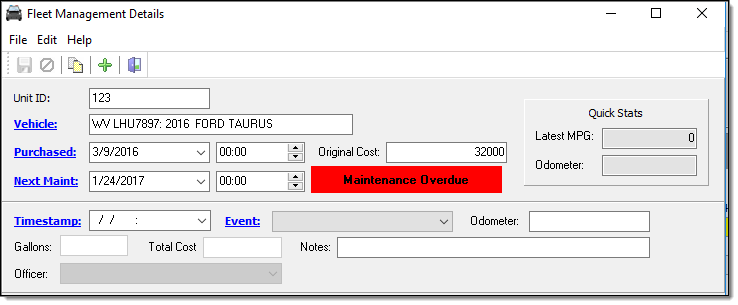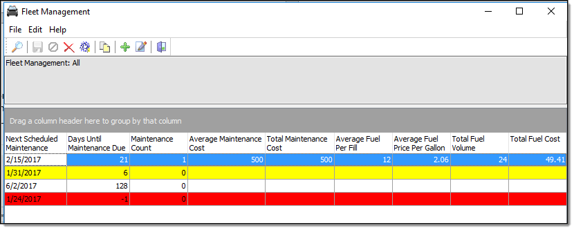 1. As mentioned earlier, the main Fleet Management grid is color coded depending on the maintenance status of the units. The selected record is always highlighted in blue. A unit highlighted in yellow indicates that a vehicle is due for service in 7 days or less. A unit highlighted in red indicates that service is past due. A unit displaying as white indicates that the service interval is within normal range.