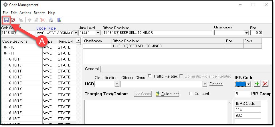 3. Repeat Step 2 for each IBR Code that needs to be associated with your Crimes Code. When finished, press the Save button (A).