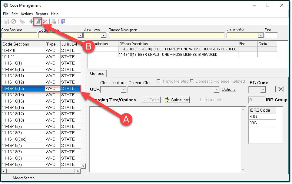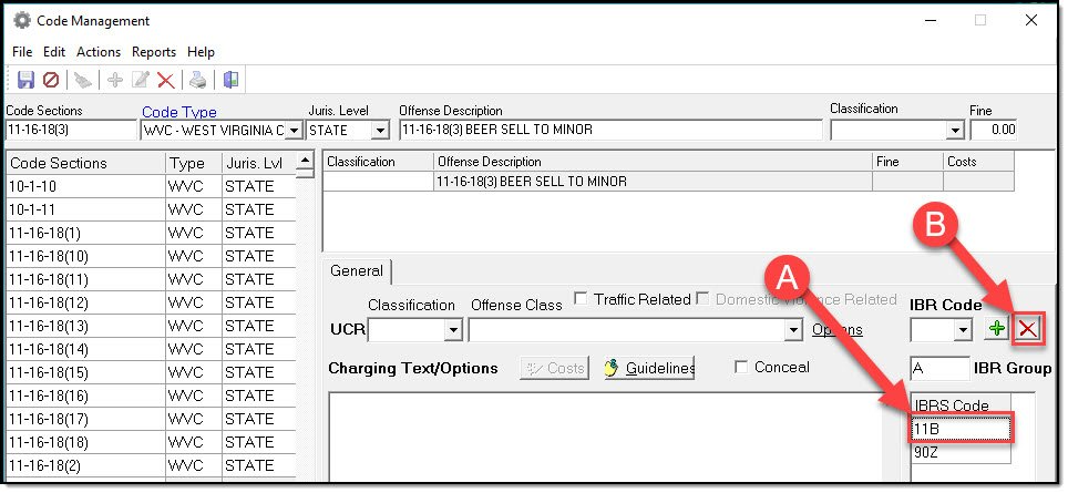 4. If you need to remove an IBR Code, edit the Crimes Code. Select the IBRS Code you need to remove (A), then press the Red X button (B).