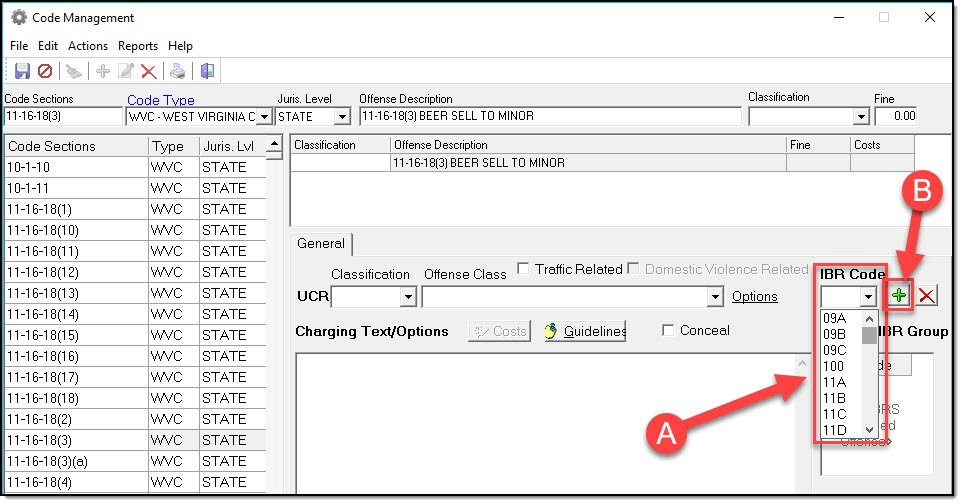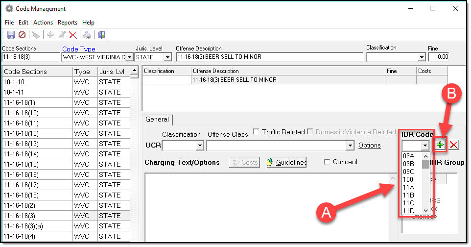 2. Select the IBR Code associated with your Crimes Code from the drop down list (A), and then press the Plus button to add it to the crimes code (B).
