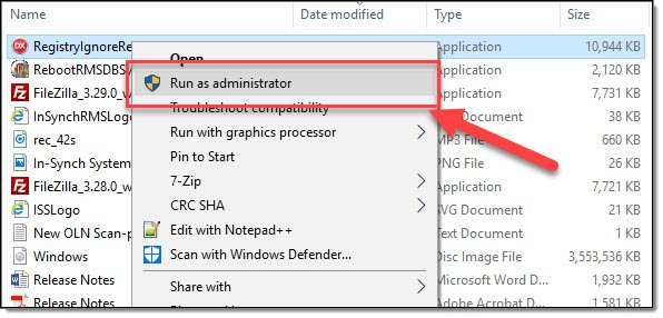 - Navigate to the location where you saved the RegistryIgnoreRemoval tool, right-click on the executable, and then select “Run as Administrator”.