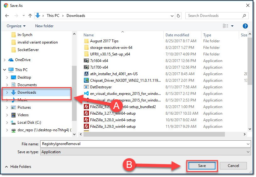- In the “Save As” window, select a storage location (A) and then select the “Save” button (B).