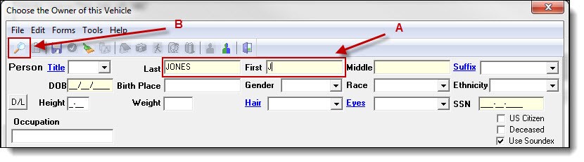 3. Enter part of the person’s last name, first name, or both (A), and then click the “Search” button (B) to see if the person exists in your database.