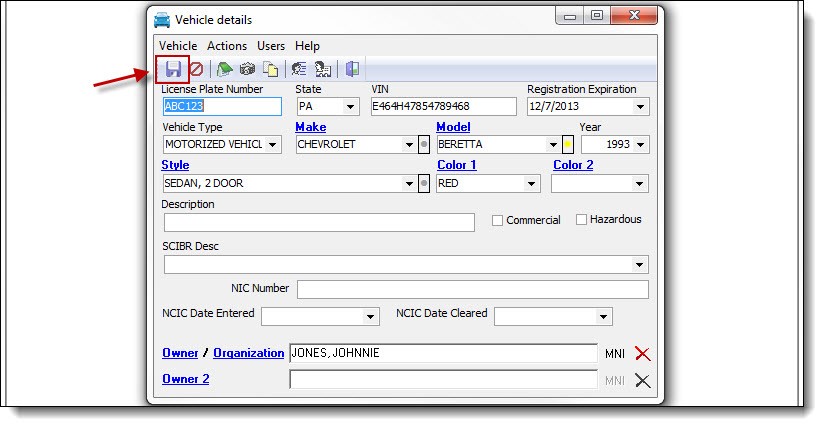 6. Save the linked owner by clicking on the “Save” button on the Vehicle details window.