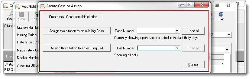 2. There are three choices from the “Create Case or Assign” window: Create new Case from this Citation, Assign this Citation to an existing Case, and Assign this Citation to an existing Call.