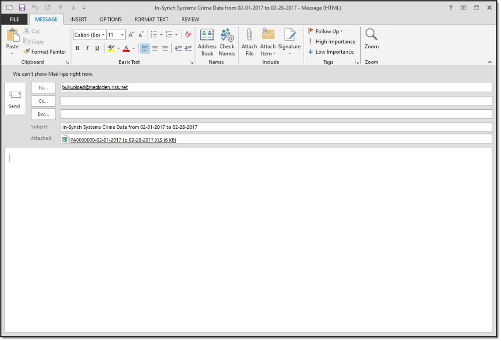 The exported data is labeled by ORI and date range and emailed to bulkupload@magloclen.riss.net as an .xls attachment.