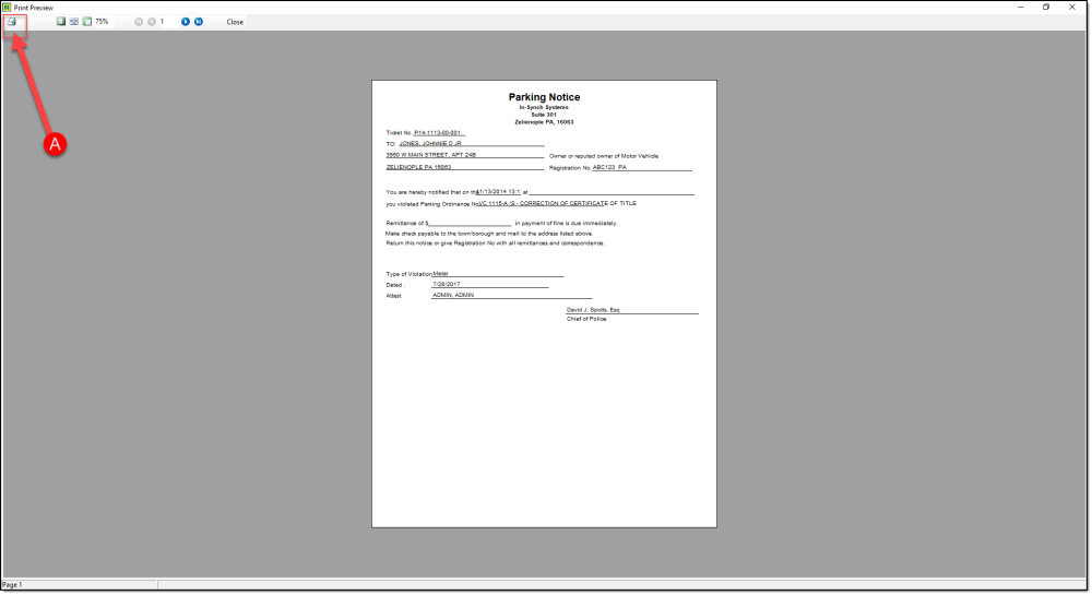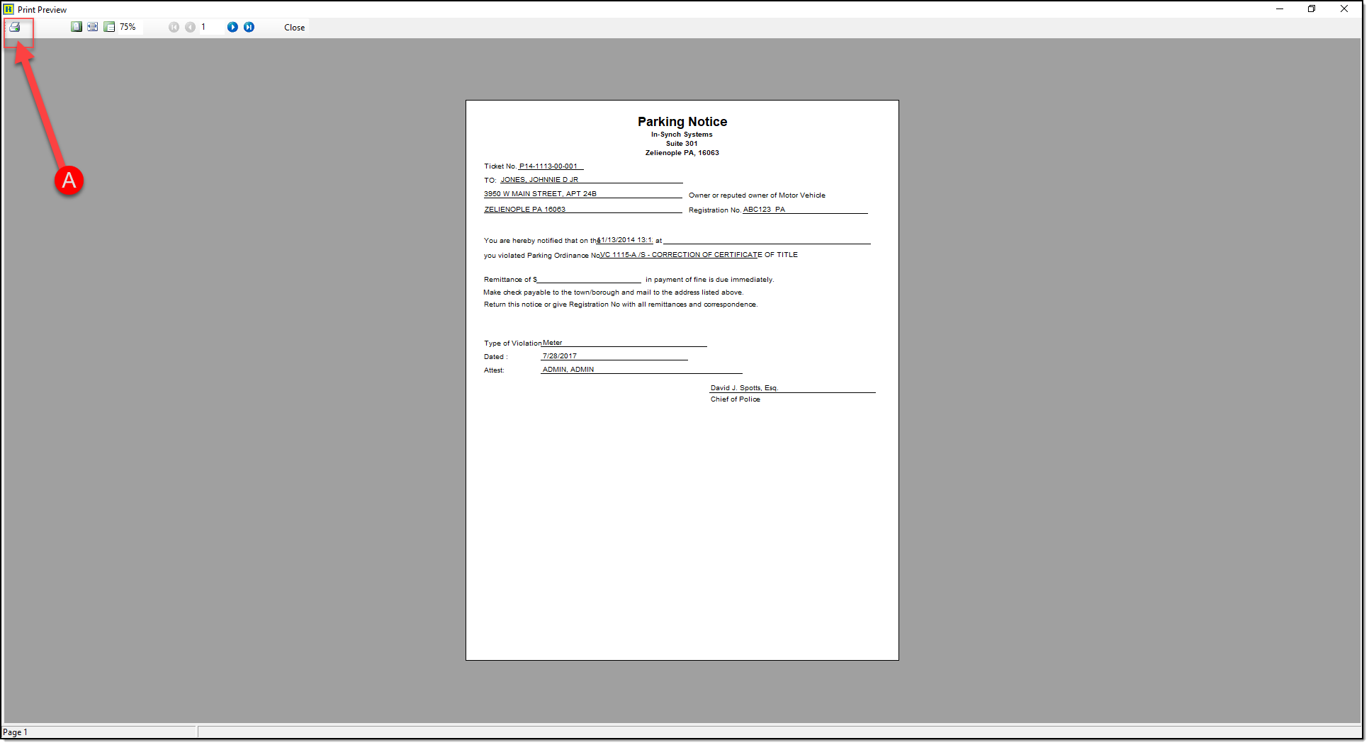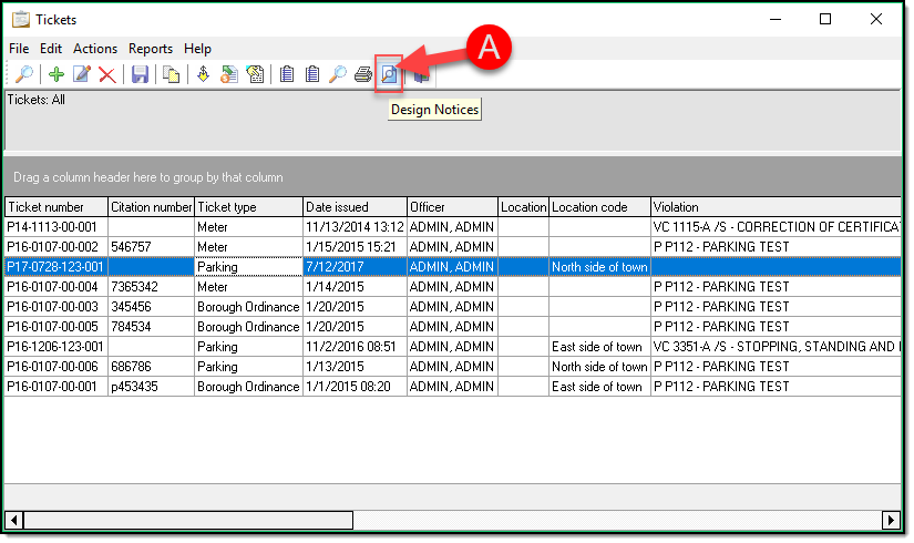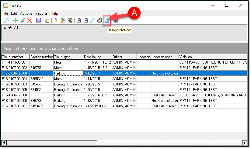 When you first install InSynch RMS, you should design your parking ticket notices. The Design Notices button (A) on the toolbar will open an editor in which you can customize the default notice letter.