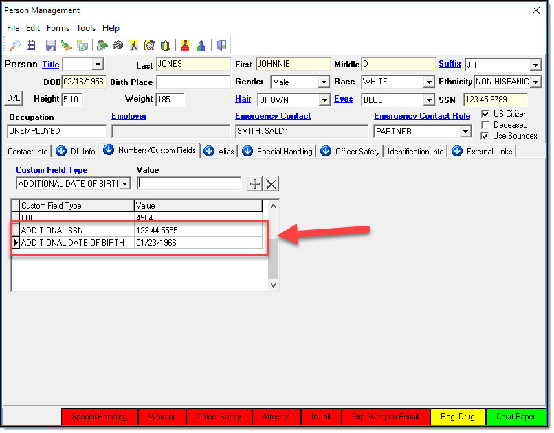 The most common Person data elements containing different values are DOB and Person SSN. Both of these items can be manually recorded in the Person “Numbers/Custom Fields” after a merge has been completed.