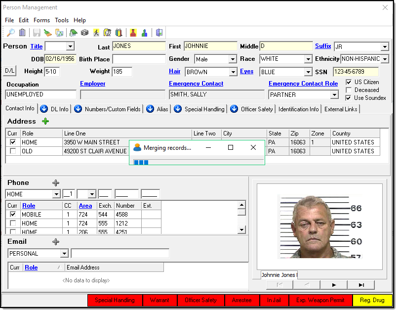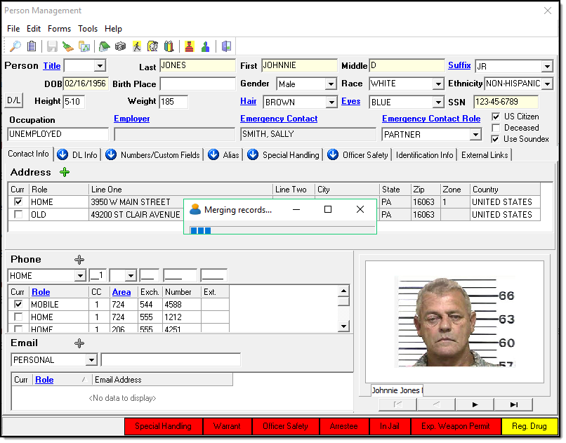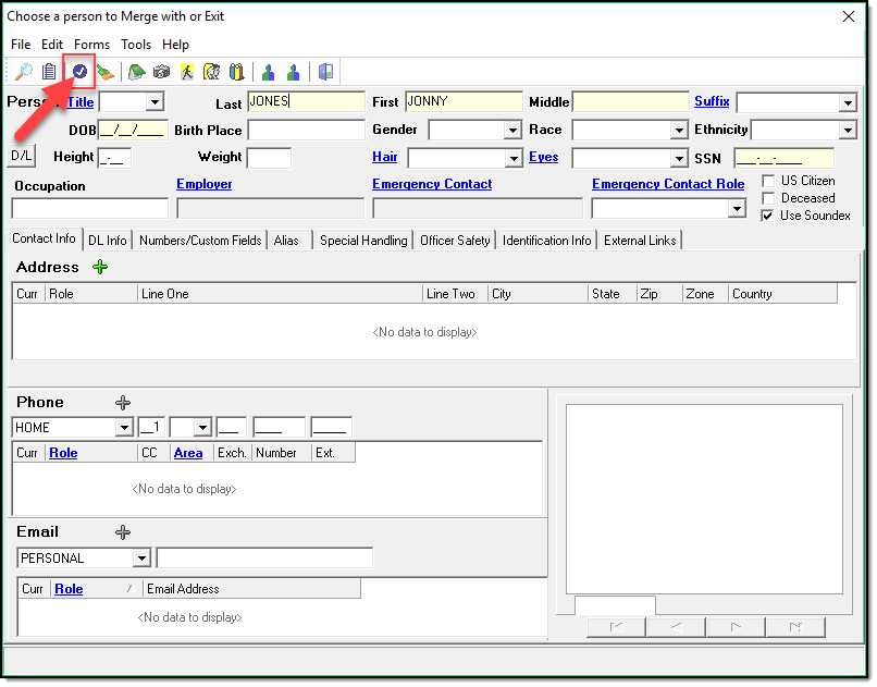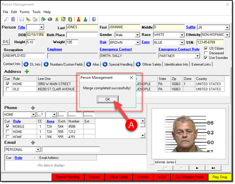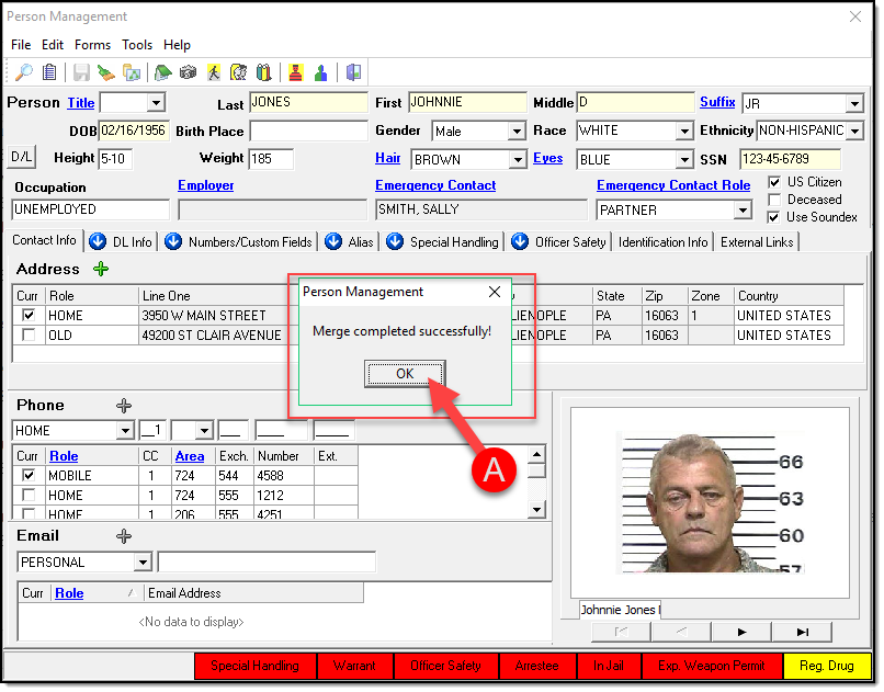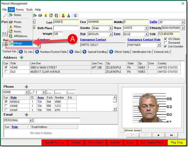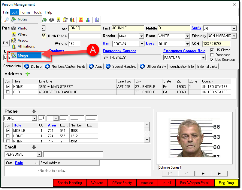 1. In the earlier section, it was determined that the “JONES, JOHNNIE” record was the Primary Record and the “JONES, JONNY” record was the Secondary Record. With the “JONES, JOHNNIE” record open in Person Management, select the “Merge” option (A) from the “Edit” drop-down list.