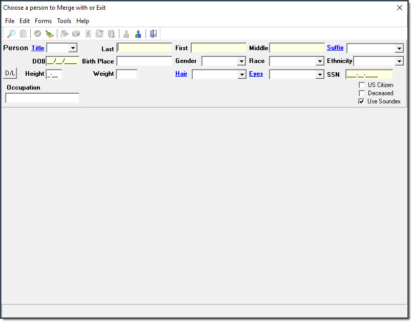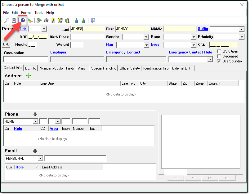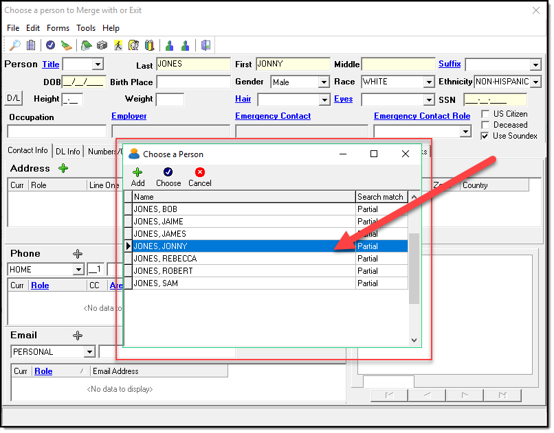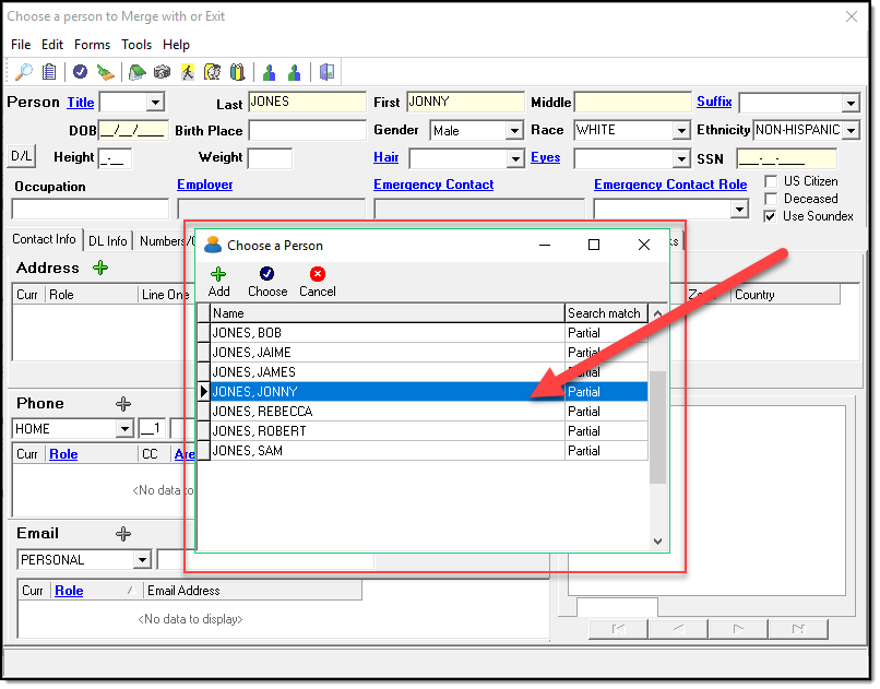 3. Search for the record you wish to merge into the Primary Record. In this example, the last name of “JONES” was searched. Notice that the Primary Record (“JONES, JOHNNIE”) no longer shows as an option in the search results.