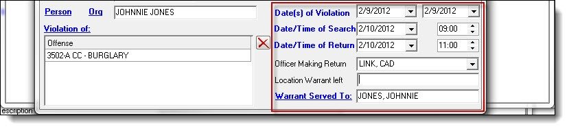 2. The bottom right section of the Search Warrant window contains fields for recording the violation, search, and return dates and times.
