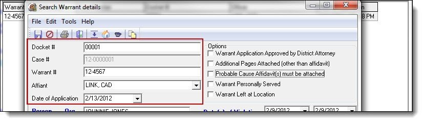 1. The top left section of the Search Warrant window contains fields for recording general warrant details such as case number, warrant number, etc.