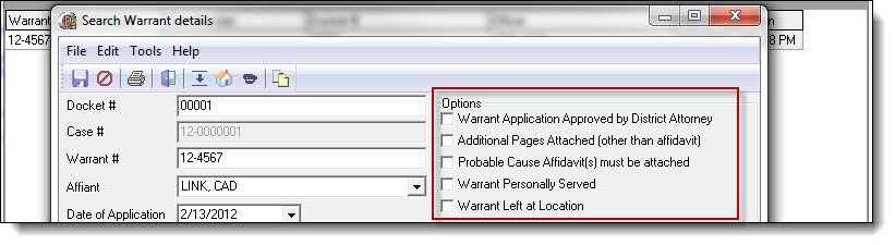 3. The top right section of the Search Warrant window contains check boxes for recording additional information about the warrant.