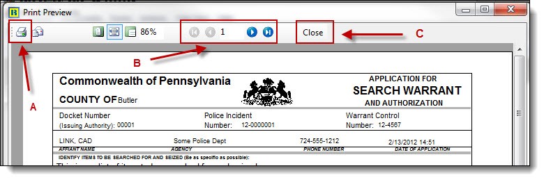 2. The “Print” button (A) is used to print the search warrant. The “Arrow” buttons (B) are used to navigate the pages of the print preview. The “Close” button ( C ) is used to close the print preview window and return to the Search Warrant details window.