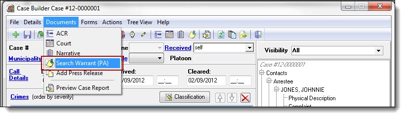 1. When a warrant or warrants are already linked to a case they will display in a grid. To view the grid of existing warrants, select the “Search Warrant (PA)” button from the Documents drop down list.