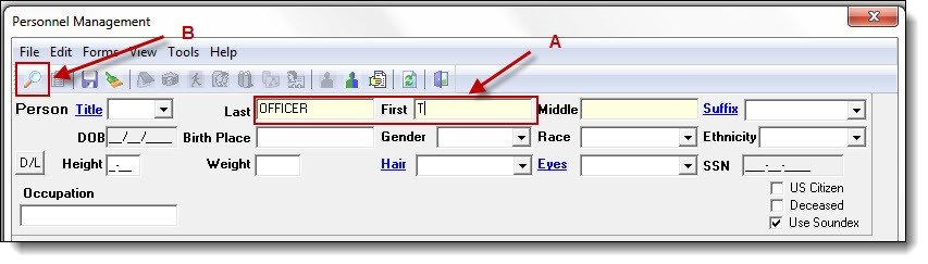 2. Enter part the officer’s last name, first name, or both (A), and then click the “Search” button (B).