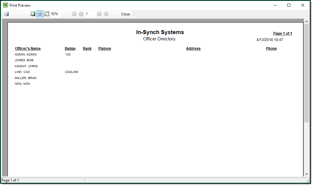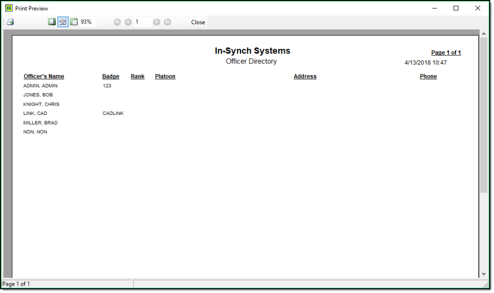 The results will provide Officers Name, Badge, Rank, Platoon, Address, and Phone if available