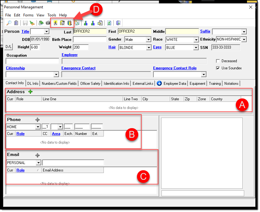 Address (A), Phone Number (B), Email ( C ), and Physical Description, Affiliation, Association (D) etc.