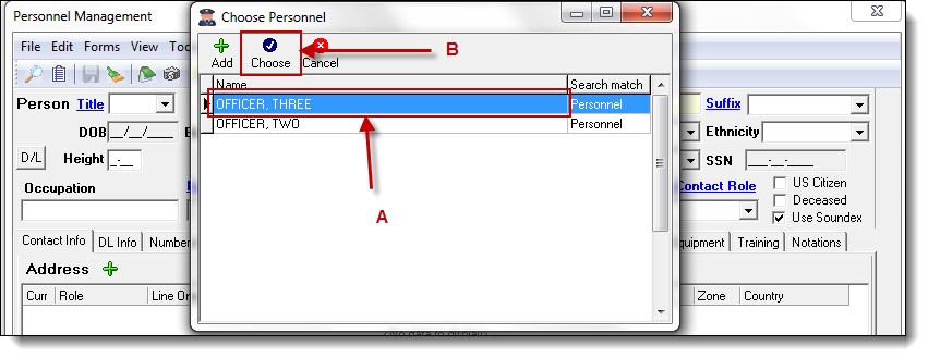 3. Highlight the officer from the result grid (A), and then click the “Choose” button (B).