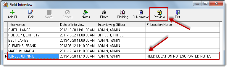 1. To preview a Field Interview, highlight the Interviewee in the grid (A), and click the “Preview” button (B).