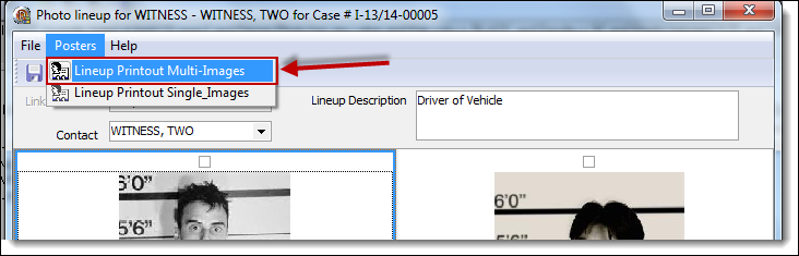 1. There are two options for printing a photo lineup: Multi-Images or Single Images. Multi-Images will print up to 6 photos per page. Single Images will print 1 photo per page. Both options are available from the Posters drop down list. For this example, we will create a Multi-Images lineup. Select the “Lineup Printout Multi-Images” button from the Posters drop down list to open the Print Preview window.