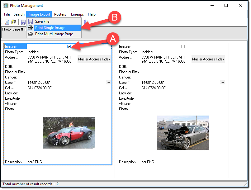 1. From the search results, select the check box of the photo you wish to print (A), and then select the “Print Single Image” button from the Image Export drop down list (B).