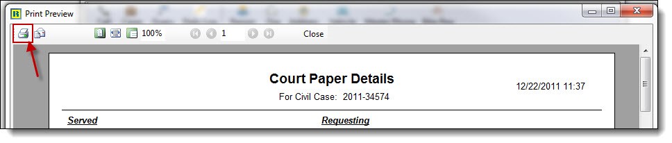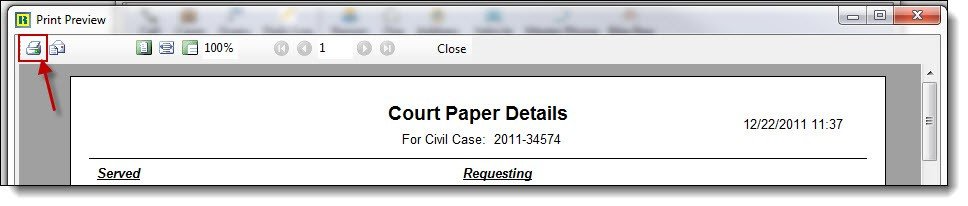 2. Click the “Print” button from the Print Preview window, to print the court paper.