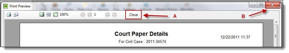 3. Click the “Close” button (A), or the “X” (B) to exit the Print Preview window.