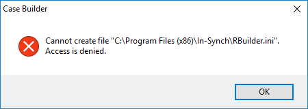 Occasionally, users may experience the following RBuilder error: “Cannot create file “C:\Program Files (x86)\In-Synch\RBuilder.ini. Access is denied.” when trying to preview a Call Summary or Case Report.