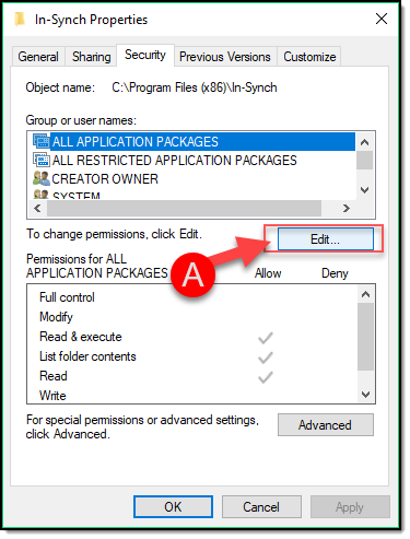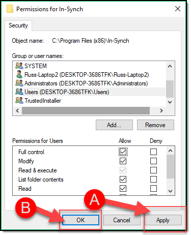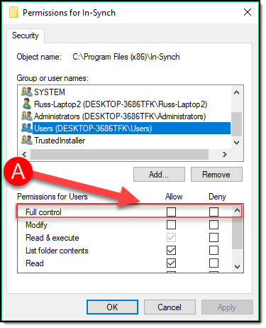 - Highlight the “Users” group and place a checkmark in the “Allow Full Control” box (A).