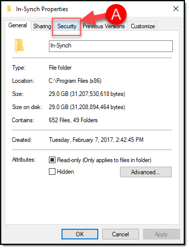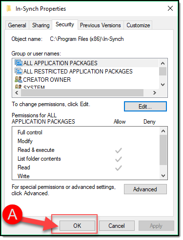 This error can be resolved by setting the appropriate permissions on the In-Synch folder. Note: If you are not the computer administrator you will need to contact your IT staff to complete this fix.