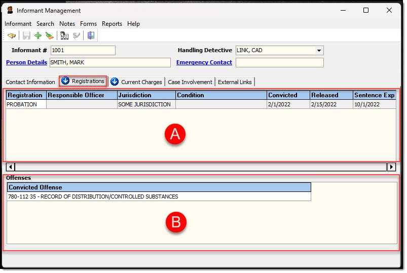 The Registrations tab displays any parole, probation, or incarceration information pertaining to the confidential informant. The top section (A) displays details of the registration, while the bottom section (B) displays any offenses linked to the registration.