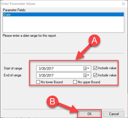 2. This opens the parameter screen. Enter the required parameters for the report (A), and press the OK button (B).