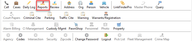 The Reports Module is a listing of individual statistical reports available in the RMS system. These reports are grouped based on the information they pertain to. To enter the Reports module, press the ‘Reports’ button on the main RMS toolbar.