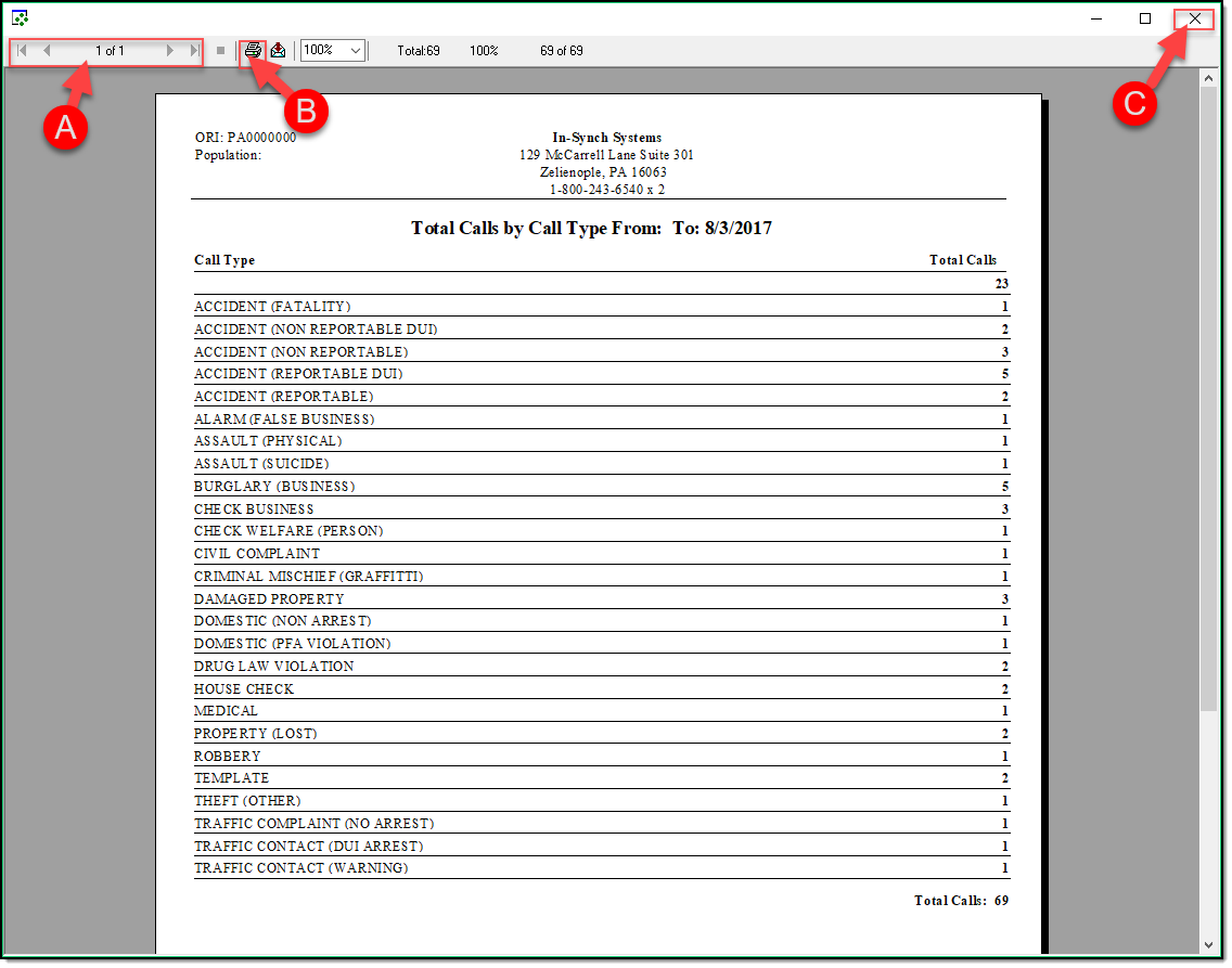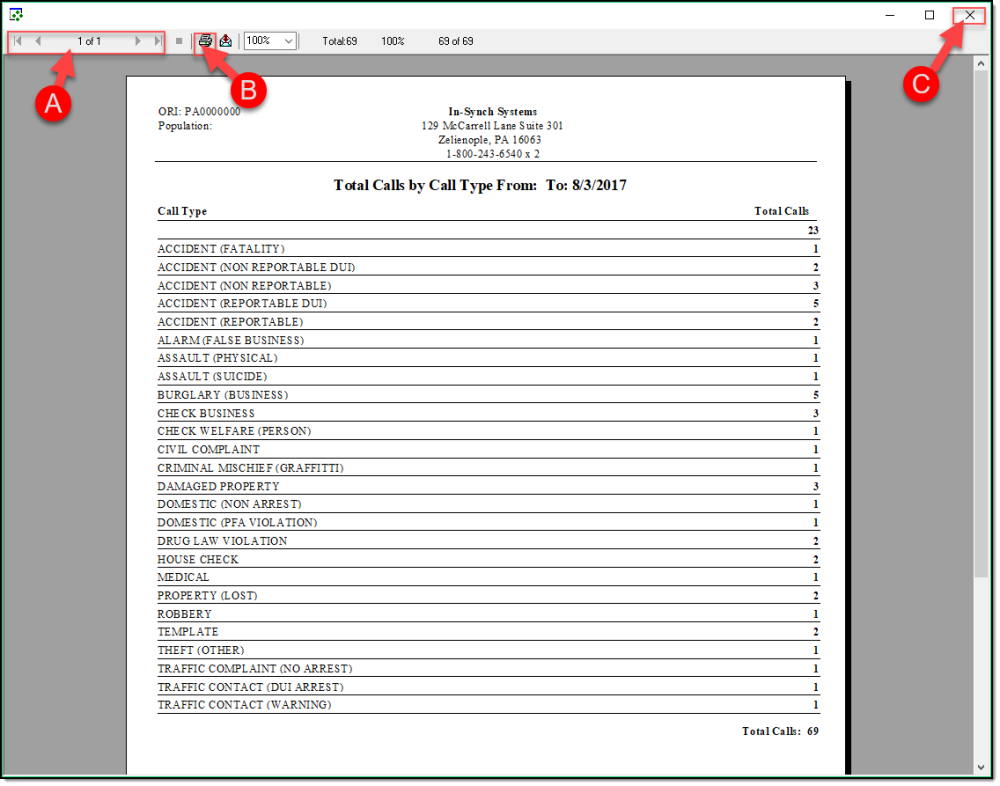 3. The report will now generate and display on the screen. If the report is more than a single page, it can be navigated by scrolling or using the page arrows (A). If the report needs to be printed, press the print button (B). When finished, simply close the report with the ‘X’ button ( C ).