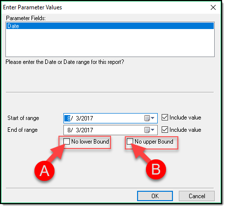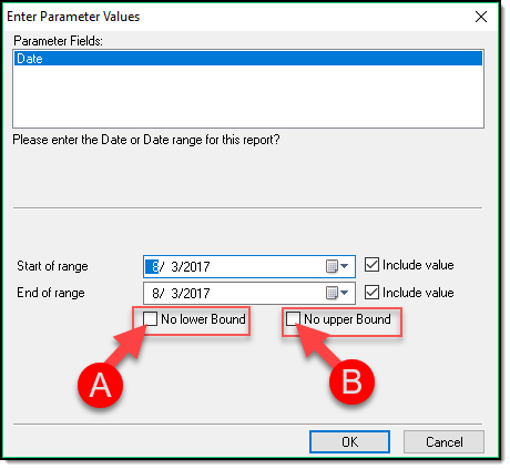 - No Lower Bounds (A) – If this option is selected, the report will return results for all records prior to the End of Range Date selected.