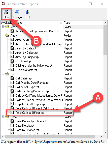 1. With the Reports module open, select the report you would like to run (A), and press the Run button (B).