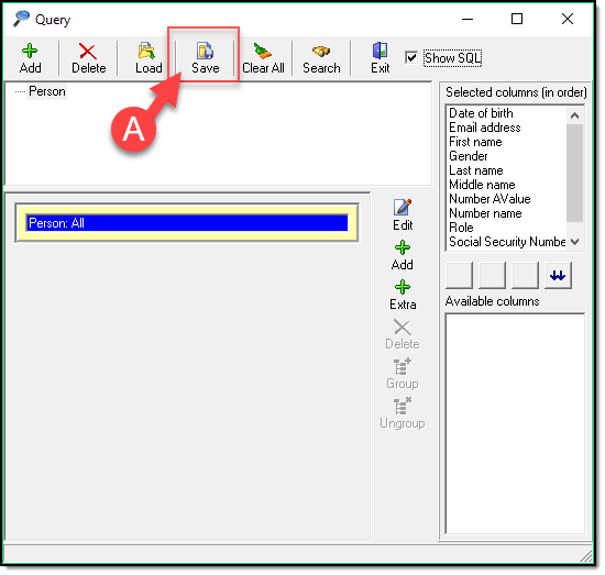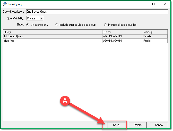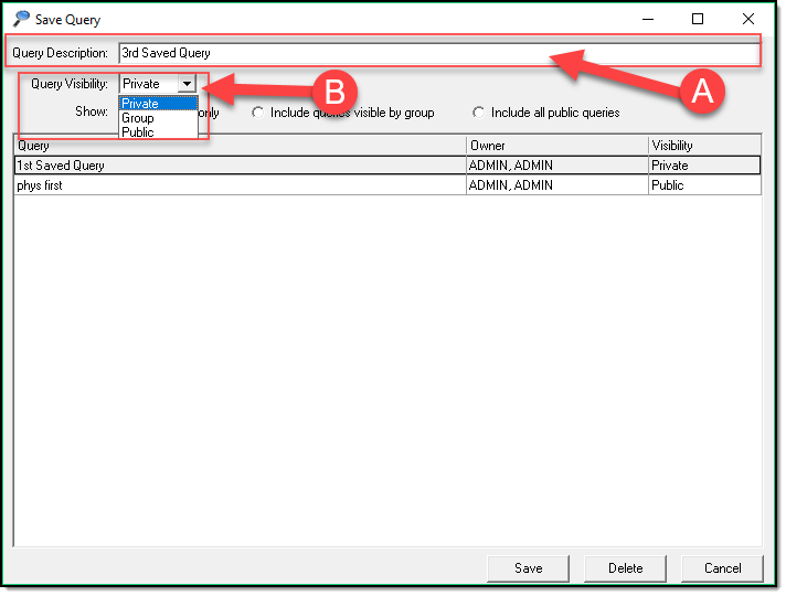 - Enter a Query Description (A), Set the Query Visibility (B) to determine who can see your Saved Query.