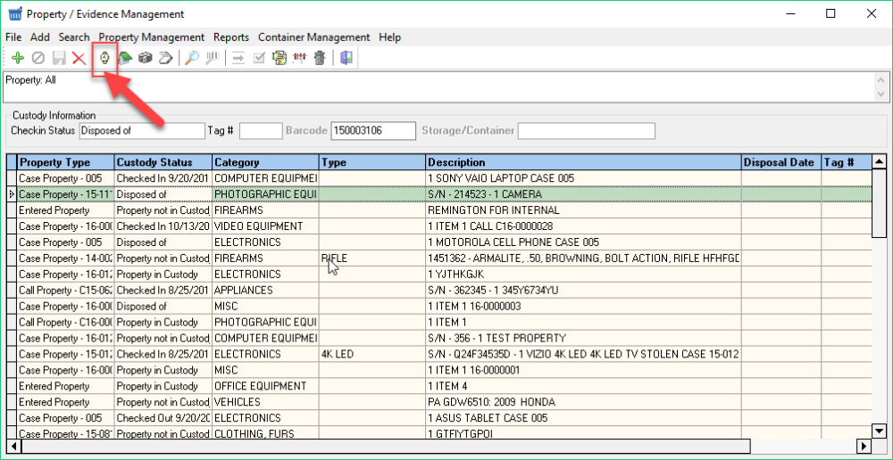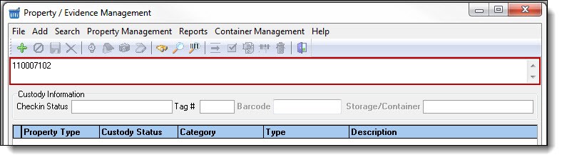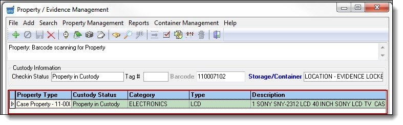 Multiple property items can be scanned, and all of the property items will display in the Property Management grid. This is useful for checking in or checking out large quantities of property to court, the lab, etc.