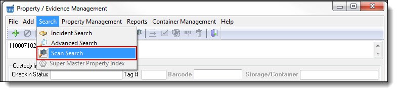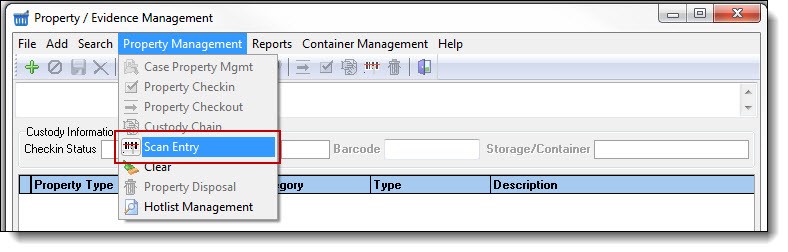 1. The third search option is using an evidence scanner/evidence pack (optional). Select “Scan Entry” from the Property Management drop down list.