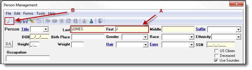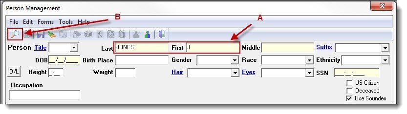 - There are five fields that are searchable in the Person Management window. Last name, first name, and middle name can be searched with as little as one character entered. The other two searchable fields are DOB and SSN, These fields must be completely entered in order to search.