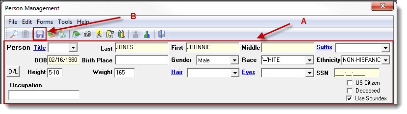 3a. If no matches were found, enter the rest of the person’s known demographic information (A), and then click the “Save” button (B).