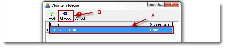 4a. If matches were found, highlight the person in the results grid (A), and then click the “Choose” button (B).