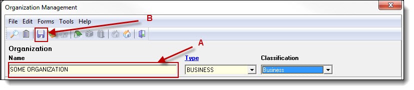 3b. Enter the rest of the organization name (A), and then click the “Save” button (B).