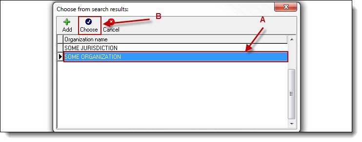 4a. If matches were found, highlight the organization in the results grid (A), and then click the “Choose” button (B)