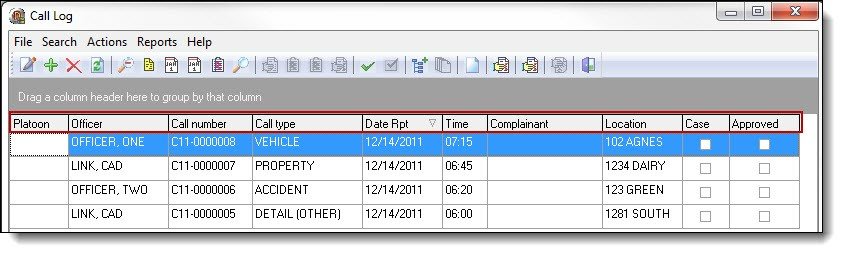 2. By default, the main Call Log window displays all calls that have been entered within the last 24 hours of your system clock. You can sort the calls ascending or descending by clicking on the individual column headers.